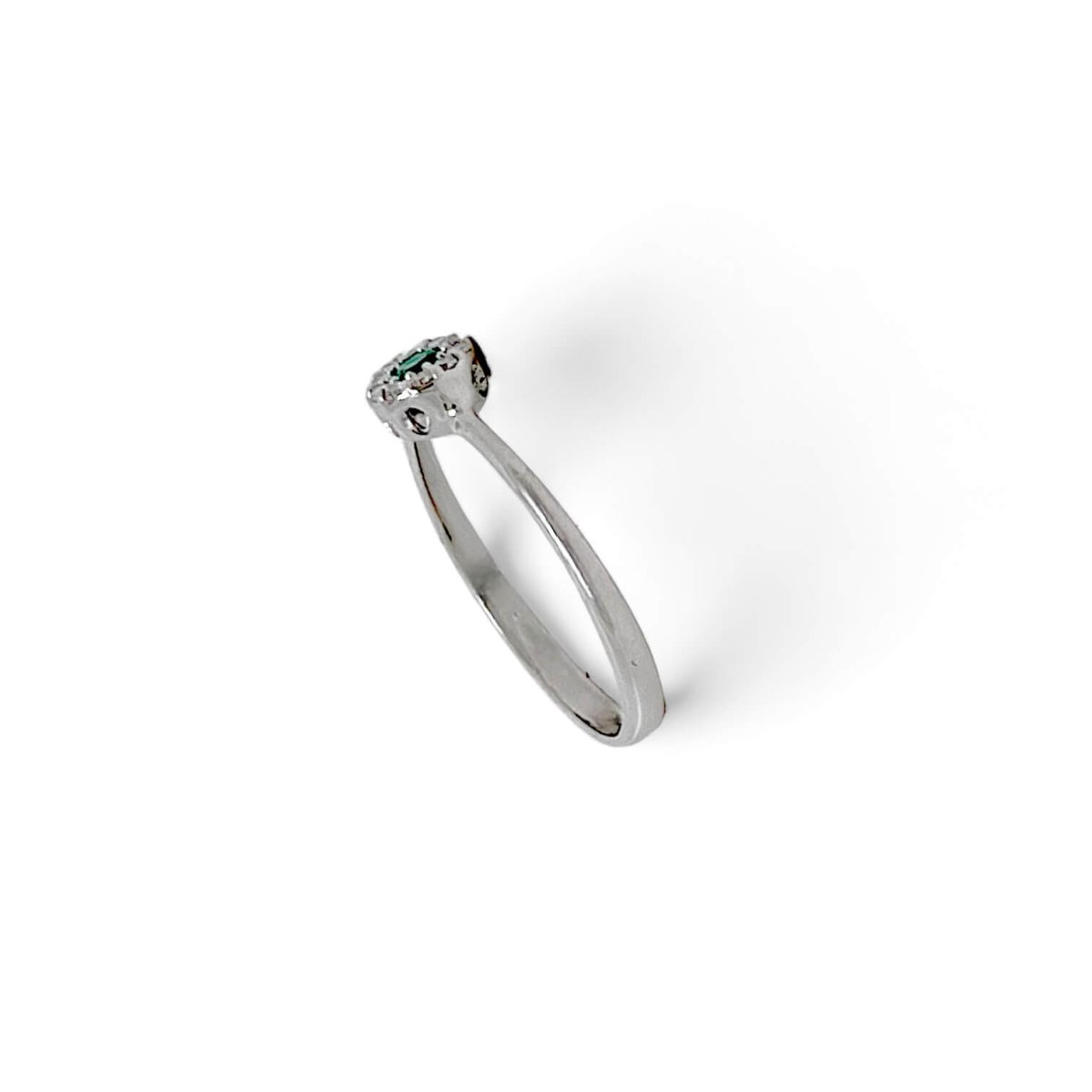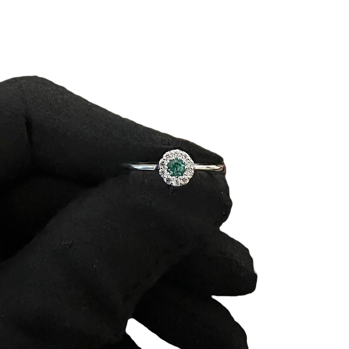 La montatura in oro bianco 750% 18KT è progettata per esaltare la bellezza delle pietre preziose, creando un connubio perfetto tra tradizione e modernità. Al centro dell’anello risplende uno smeraldo naturale di 0,08 carati, tagliato rotondo per massimizzare la sua lucentezza e vivacità. Questo smeraldo, simbolo di rinascita e speranza, è affiancato da diamanti purissimi con un peso complessivo di 0,09 carati, colore F e purezza VS1, tagliati brillantemente per garantire una scintillazione unica.