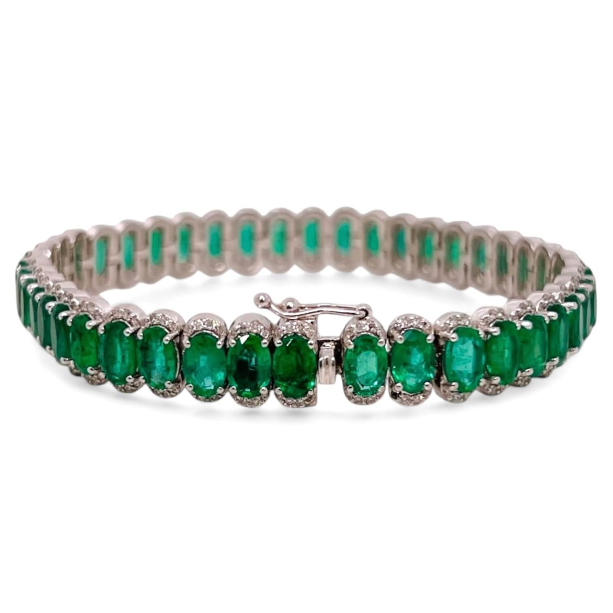 Bracciale tennis di smeraldi Cipolla dal 1950 gioielli collezione GEMME, Montatura a griffe piatte in oro bianco 18 carati 750% chiusura a baionetta con doppia sicura Smeraldi provenienza Colombia 18,50 Ct taglio ovale colore verde brillante, diamanti peso 1,25 ct colore F purezza VS1 taglio brillante