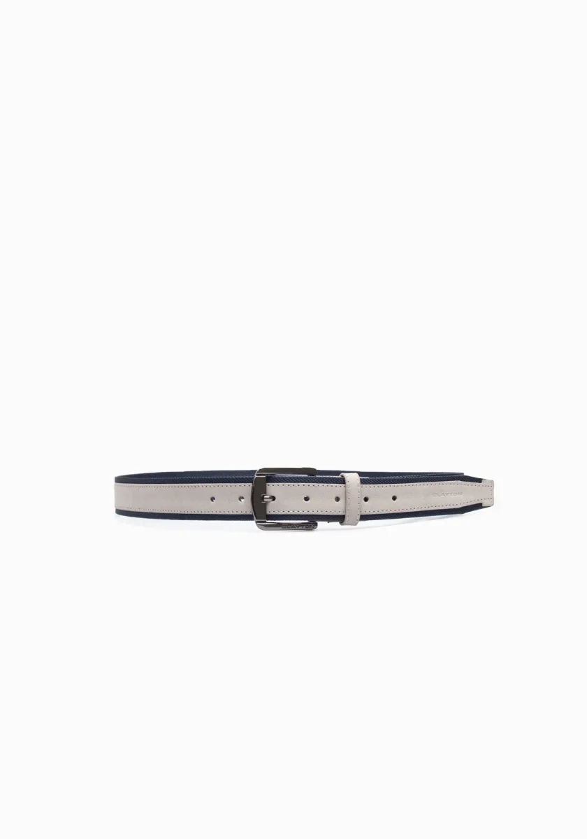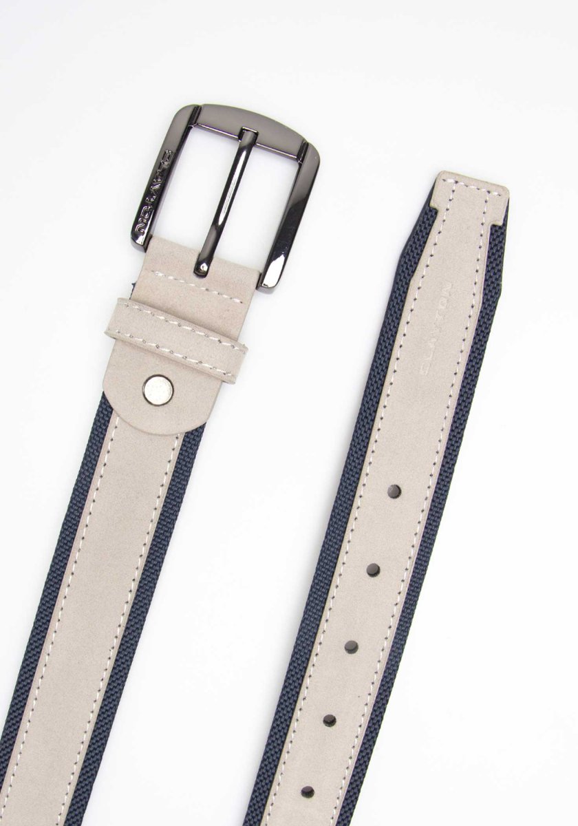 Cintura effetto camoscio con bordi a contrasto. Fibbia metallica. Misure: 120 cm (fibbia compresa) x 3,5 cm.