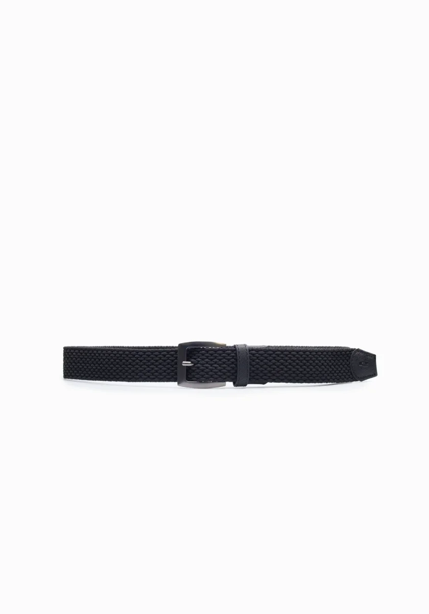 Cintura elastica intrecciata con inserti in pelle sintetica e fibbia in metallo. Misure: 120 cm (fibbia compresa) x 3,5 cm.