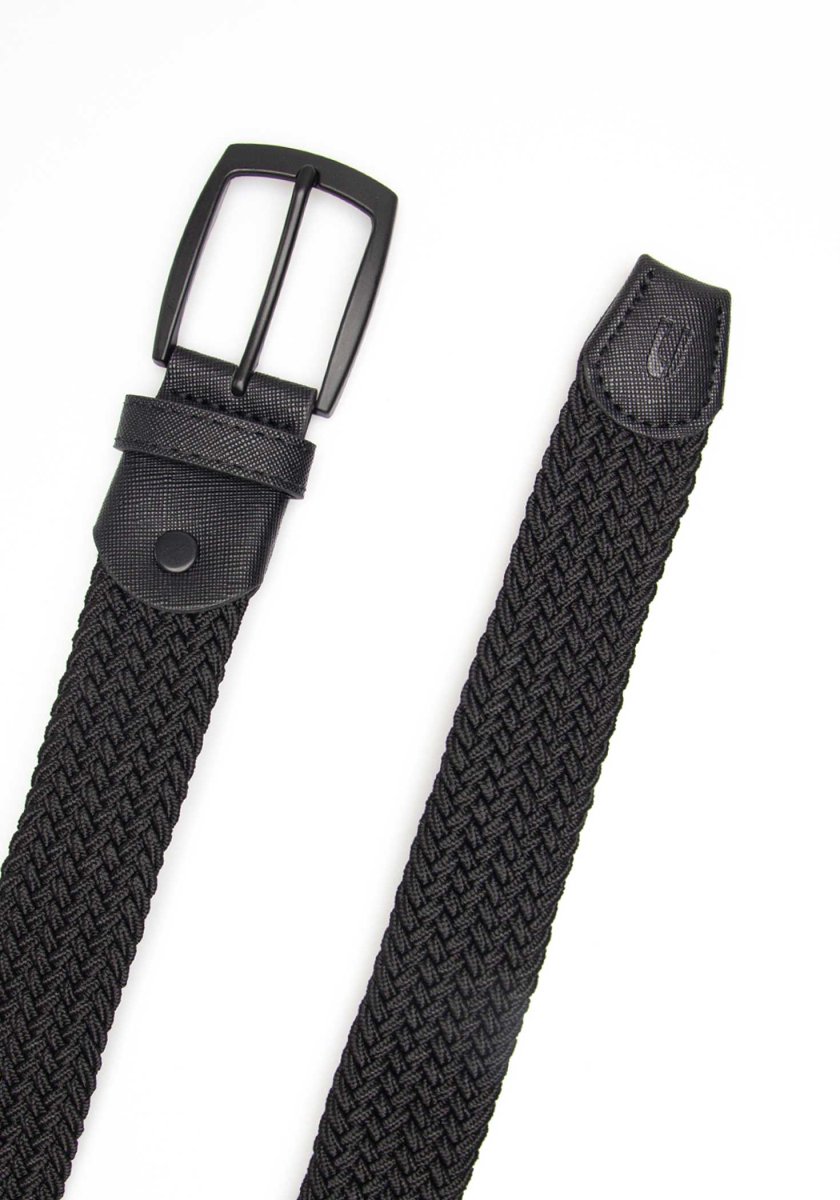 Cintura elastica intrecciata con inserti in pelle sintetica e fibbia in metallo. Misure: 120 cm (fibbia compresa) x 3,5 cm.
