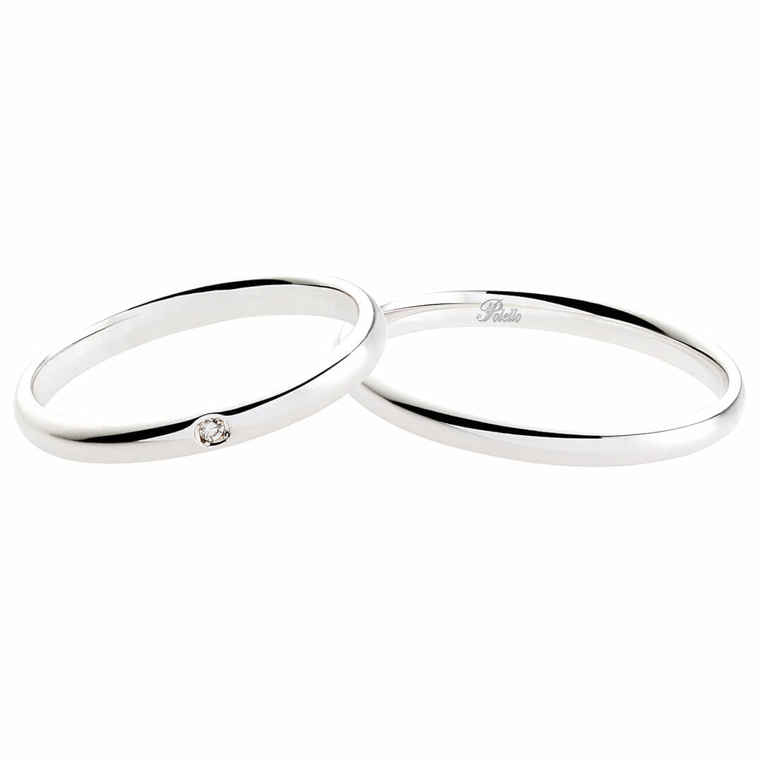 Fedi nuziali Polello collezione Semplicemente Amore in oro bianco 18kt proposte con diamanti ct. 0.01 nella versione femminile e senza diamanti nella versione maschile.