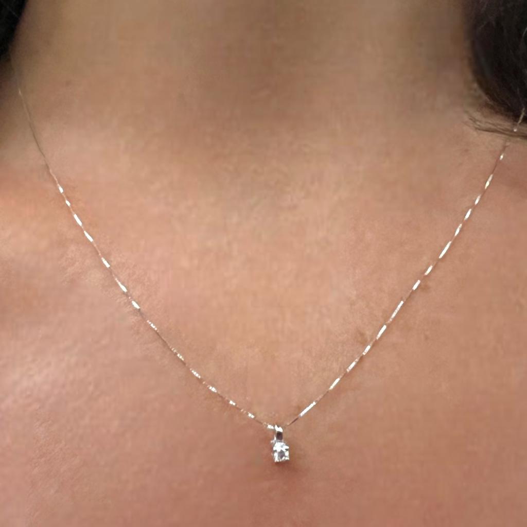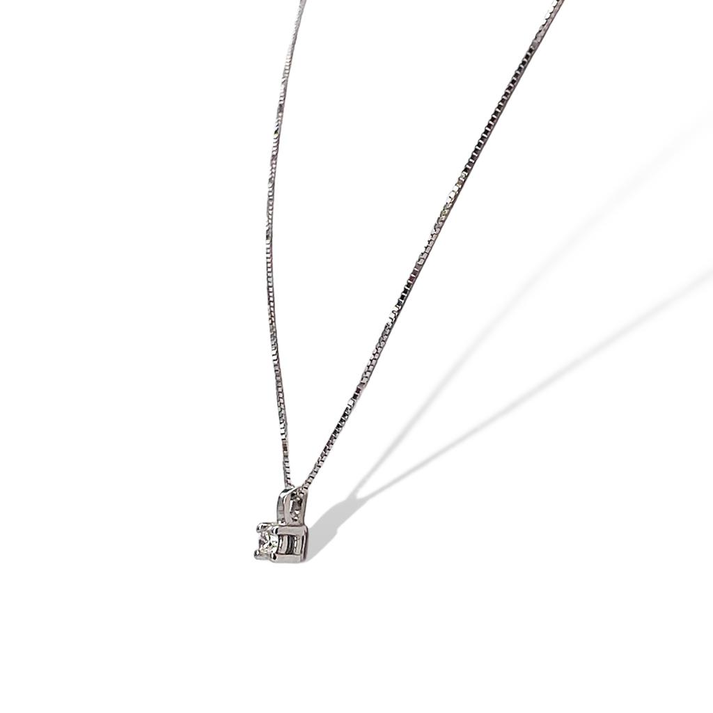 La catenina maglia veneziana, anch’essa in oro bianco 750%, è dotata di un doppio anellino che permette di regolare la lunghezza per una vestibilità perfetta. La lavorazione artigianale si riflette in ogni dettaglio, dalla precisione della montatura alla scelta delle pietre, creando un gioiello che è sia un piacere da indossare che un’opera d’arte da ammirare.