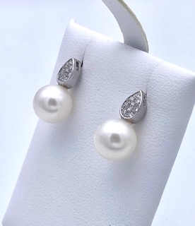 Orecchini di perle Cipolla dal 1950 Gioiellieri lavorazione artigianale, montatura in oro bianco 750% 18 kt, Diamanti caratura 0,14 ct colore F purezza VS1 taglio brillante perle fresh water 9,5-10 mm