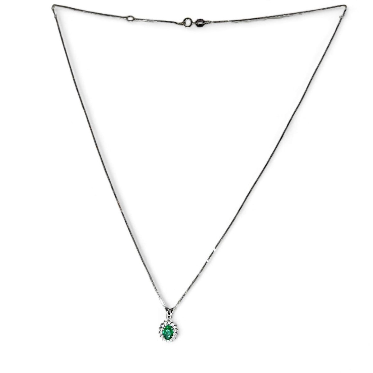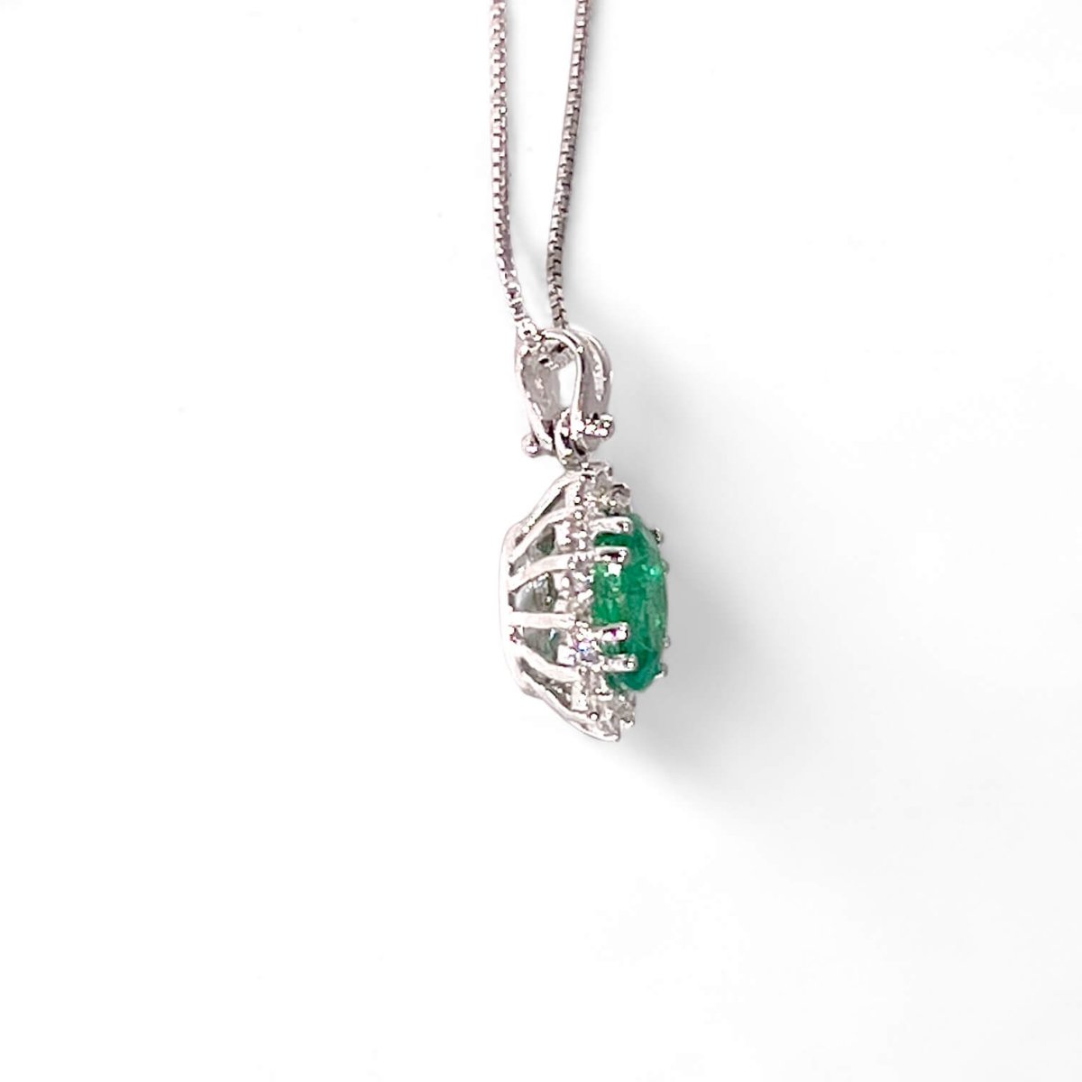 La montatura in oro bianco 750% incornicia magnificamente lo splendido smeraldo colombiano, con un peso di 0,75 carati. La sua intensa tonalità verde, simbolo di vitalità e rinascita, aggiunge un tocco di freschezza e luminosità al pendente, catturando lo sguardo con la sua bellezza naturale.
